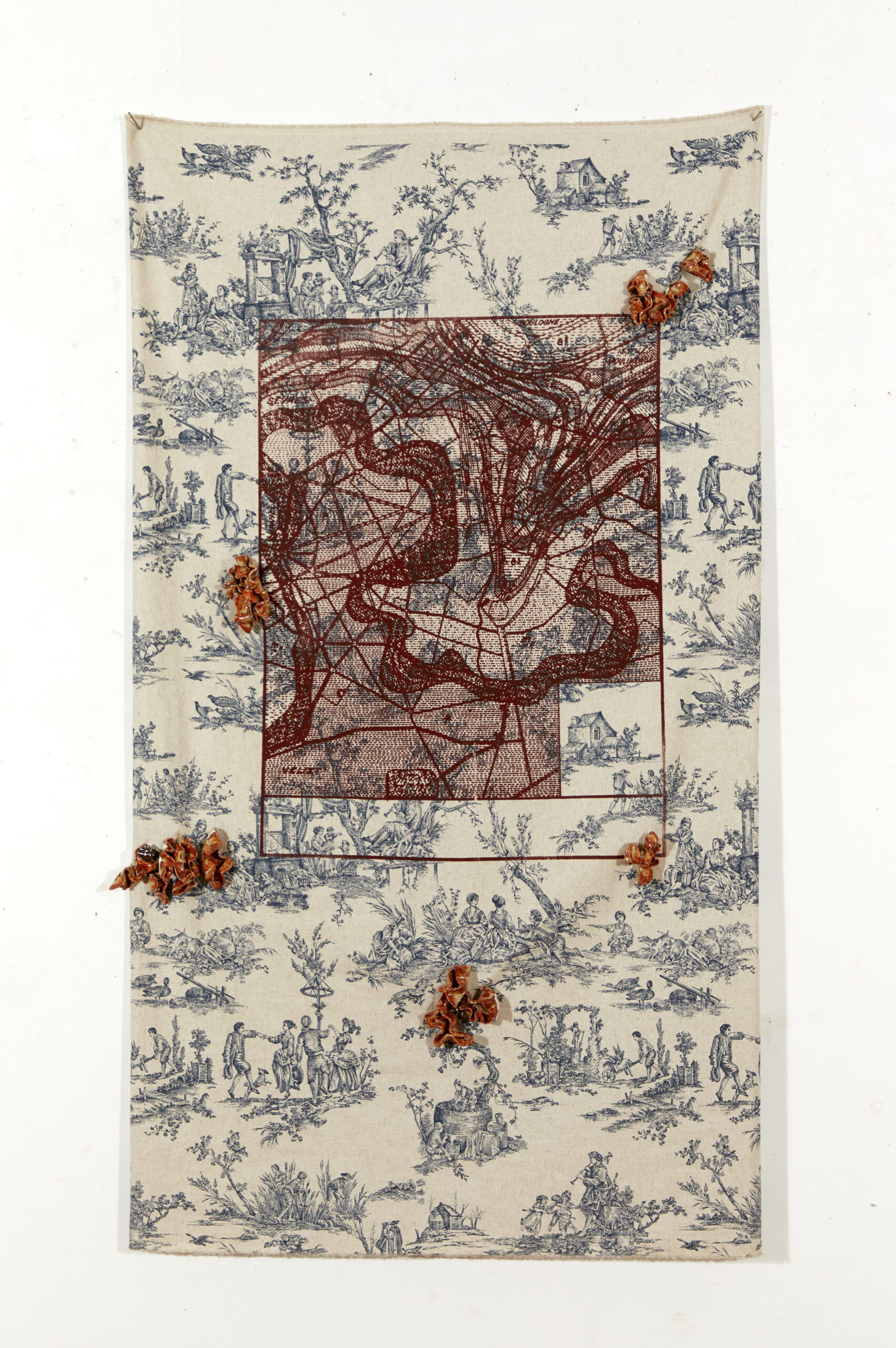 Après une semaine d’exploration dans le territoire qui nous a été attribué par le CAUE, Meudon et sa forêt sont soudainement devenus un lieu familier, un paysage de production créatif. Le projet qui est né de cette rencontre est une tapisserie qui allie des découvertes organiques, mais aussi des archives collectées. L’objectif est de peindre un portrait d’un lieu à travers des références et allusions à son histoire, sa nature en les superposant pour en créé une pièce singulière.